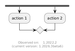 @startuml fork :action 1; -> missing arrow label; fork again :action 2; -> missing arrow label; end merge footer \nObserved on: 1.2022.2\n(current version: %version()) @enduml