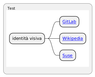 @startuml skinparam FontColor red : Test {{mindmap skinparam FontColor red * identità visiva ** [[https://about.gitlab.com/handbook/marketing/corporate-marketing/brand-activation/brand-standards/ GitLab]] ** [[https://foundation.wikimedia.org/wiki/Visual_identity_guidelines Wikipedia]] ** [[https://brand.suse.com/brand-system Suse]] }} ; @enduml
