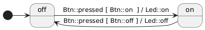 @startuml ' ' Copyright (c) 2020 Kris Jusiak (kris at jusiak dot net) ' ' Distributed under the Boost Software License, Version 1.0. ' (See accompanying file LICENSE_1_0.txt or copy at http://www.boost.org/LICENSE_1_0.txt) ' [*] -> off off -> on : Btn::pressed [ Btn::on ] / Led::on on -> off : Btn::pressed [ Btn::off ] / Led::off @enduml