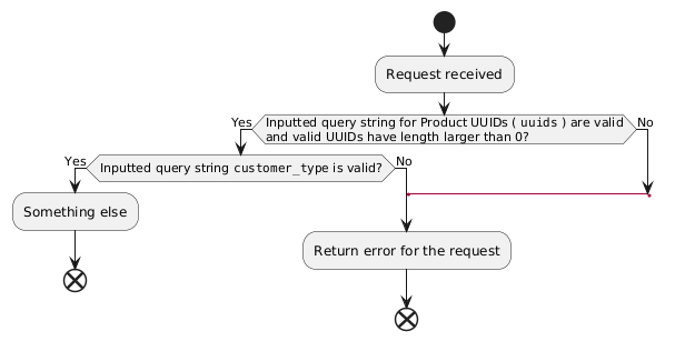 @startuml start :Request received; if (Inputted query string for Product UUIDs ( ""uuids"" ) are valid\nand valid UUIDs have length larger than 0?) then (Yes) if (Inputted query string ""customer_type"" is valid?) then (Yes) :Something else; end else (No) label lab1 :Return error for the request; end endif else (No) label padding1 goto lab1 endif @enduml