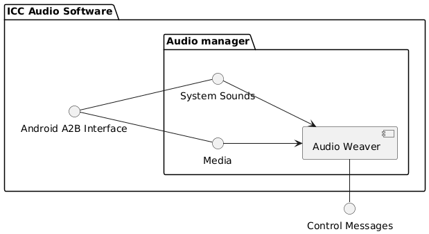 @startuml left to right direction interface "Control Messages" as CM package "ICC Audio Software" { interface "Android A2B Interface" as A2B package "Audio manager" { CM - [Audio Weaver] interface "Media" A2B -- Media Media --> [Audio Weaver] '... interface "System Sounds" as System_Sounds A2B -- System_Sounds System_Sounds --> [Audio Weaver] } } @enduml