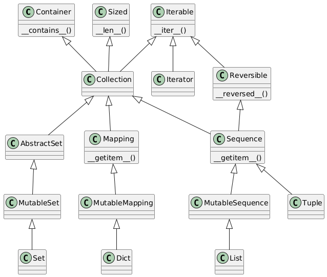 @startuml Container <|-- Collection Container : __contains__() Sized <|-- Collection Sized : __len__() Iterable <|-- Collection Iterable <|-- Reversible Iterable : __iter__() Collection <|-- Sequence Reversible <|-- Sequence Reversible : __reversed__() Sequence <|-- MutableSequence Sequence : __getitem__() Collection <|-- AbstractSet AbstractSet <|-- MutableSet MutableSequence <|-- List MutableSet <|-- Set Sequence <|-- Tuple Collection <|-- Mapping Mapping <|-- MutableMapping Mapping : __getitem__() MutableMapping <|-- Dict Iterable <|-- Iterator @enduml