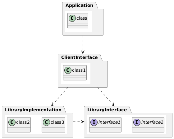 @startuml package Application [ {{ class class }} ] package ClientInterface [ {{ class class1 }} ] package LibraryInterface [ {{ interface interface1 interface interface2 }} ] package LibraryImplementation [ {{ class class2 class class3 }} ] Application ..> ClientInterface ClientInterface .down.> LibraryInterface ClientInterface .down.> LibraryImplementation LibraryImplementation .right.> LibraryInterface @enduml