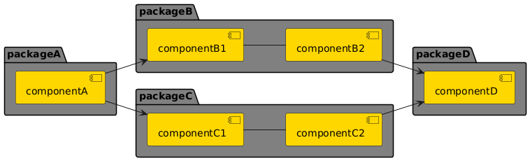 @startuml left to right direction skinparam package { backgroundColor Gray } skinparam component { backgroundColor Gold } package "packageA" { [componentA] } package "packageB" { [componentB1] -- [componentB2] } package "packageC" { [componentC1] -- [componentC2] } package "packageD" { [componentD] } componentA --> componentB1 componentA --> componentC1 componentB2 --> [componentD] componentC2 --> [componentD] @enduml