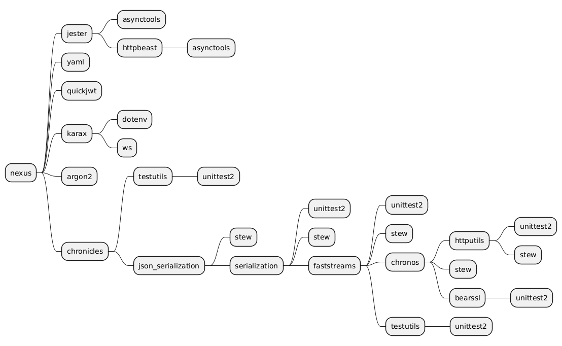@startmindmap * nexus ** jester *** asynctools *** httpbeast **** asynctools ** yaml ** quickjwt ** karax *** dotenv *** ws ** argon2 ** chronicles *** testutils **** unittest2 *** json_serialization **** stew **** serialization ***** unittest2 ***** stew ***** faststreams ****** unittest2 ****** stew ****** chronos ******* httputils ******** unittest2 ******** stew ******* stew ******* bearssl ******** unittest2 ****** testutils ******* unittest2 @endmindmapn