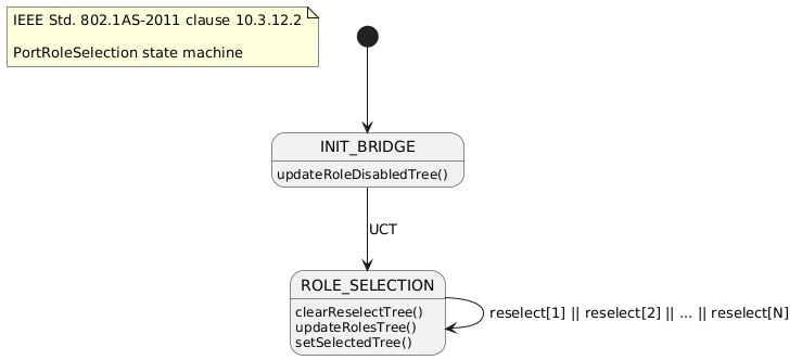 @startuml INIT_BRIDGE : updateRoleDisabledTree() ROLE_SELECTION : clearReselectTree() ROLE_SELECTION : updateRolesTree() ROLE_SELECTION : setSelectedTree() note as N1 IEEE Std. 802.1AS-2011 clause 10.3.12.2 PortRoleSelection state machine end note [*] --> INIT_BRIDGE INIT_BRIDGE --> ROLE_SELECTION : UCT ROLE_SELECTION -->ROLE_SELECTION : reselect[1] || reselect[2] || ... || reselect[N] @enduml