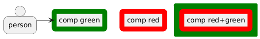 @startuml hide stereotype <style> rectangle { .zoneGreen { LineColor green LineThickness 10 } .zoneRed { LineColor red LineThickness 10 } } group { BackGroundColor green LineColor green LineThickness 1 } </style> person "person" <<p>> rectangle "comp green" as cg <<zoneGreen>> card { rectangle "comp red+green" as crg <<zoneRed>> } rectangle "comp red" as cr <<zoneRed>> person -> cg @enduml