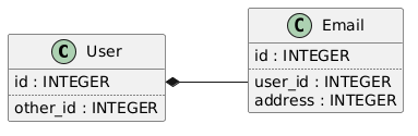 @startuml left to right direction class User { id : INTEGER .. other_id : INTEGER } class Email { id : INTEGER .. user_id : INTEGER address : INTEGER } User::id *-- Email::user_id @enduml
