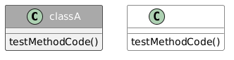 @startuml skinparam classFontColor white skinparam classHeaderBackgroundColor darkgray class classA { testMethodCode() } class classB #fff { testMethodCode() } @enduml