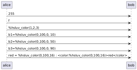 @startuml <style> document { BackGroundColor %hsluv_color(0,50,16, 50) } </style> alice -> bob : %hex2dec("ff") alice -> bob : %dec2hex(15) alice -> bob : %hsluv_color(1,2,3) alice -> bob : b1=%hsluv_color(0,100,0, 10) alice -> bob : b2=%hsluv_color(0,100,0, 50) alice -> bob : b3=%hsluv_color(0,100,0, 90) alice -> bob : red = %hsluv_color(0,100,16) : <color:%hsluv_color(0,100,16)>red</color> @enduml