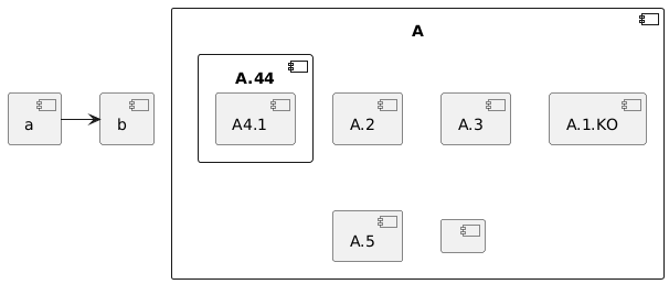 @startuml skinparam BackgroundColor transparent skinparam componentStyle uml2 'skinparam componentStyle rectangle component A { component "A.1.KO" { } component A.44 { [A4.1] } component "A.2" [A.3] component A.5 [ A.5] component A.6 [ ] } [a]->[b] @enduml