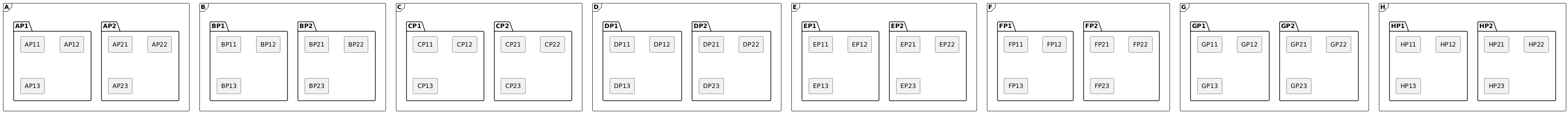 @startuml frame "A" { package "AP1" { rectangle "AP11" rectangle "AP12" rectangle "AP13" } package "AP2" { rectangle "AP21" rectangle "AP22" rectangle "AP23" } } frame "B" { package "BP1" { rectangle "BP11" rectangle "BP12" rectangle "BP13" } package "BP2" { rectangle "BP21" rectangle "BP22" rectangle "BP23" } } frame "C" { package "CP1" { rectangle "CP11" rectangle "CP12" rectangle "CP13" } package "CP2" { rectangle "CP21" rectangle "CP22" rectangle "CP23" } } frame "D" { package "DP1" { rectangle "DP11" rectangle "DP12" rectangle "DP13" } package "DP2" { rectangle "DP21" rectangle "DP22" rectangle "DP23" } } frame "E" { package "EP1" { rectangle "EP11" rectangle "EP12" rectangle "EP13" } package "EP2" { rectangle "EP21" rectangle "EP22" rectangle "EP23" } } frame "F" { package "FP1" { rectangle "FP11" rectangle "FP12" rectangle "FP13" } package "FP2" { rectangle "FP21" rectangle "FP22" rectangle "FP23" } } frame "G" { package "GP1" { rectangle "GP11" rectangle "GP12" rectangle "GP13" } package "GP2" { rectangle "GP21" rectangle "GP22" rectangle "GP23" } } frame "H" { package "HP1" { rectangle "HP11" rectangle "HP12" rectangle "HP13" } package "HP2" { rectangle "HP21" rectangle "HP22" rectangle "HP23" } } @enduml