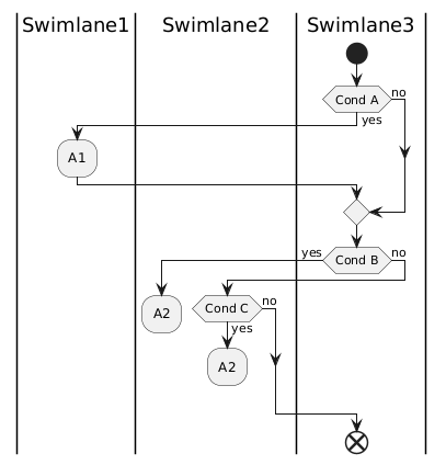 @startuml |Swimlane1| |Swimlane2| |Swimlane3| start if (Cond A) then (yes) |Swimlane1| :A1; else (no) endif |Swimlane3| if (Cond B) then (yes) |Swimlane2| :A2; kill else (no) if (Cond C) then (yes) ' |Swimlane2| :A2; kill else (no) endif endif |Swimlane3| end @enduml