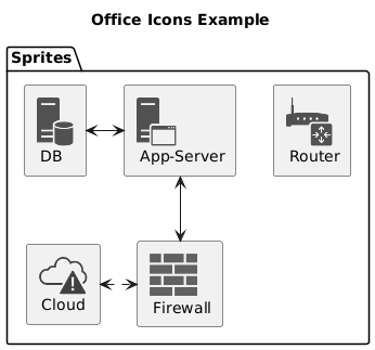 @startuml !include <tupadr3/common> !include <office/Servers/database_server> !include <office/Servers/application_server> !include <office/Concepts/firewall_orange> !include <office/Clouds/cloud_disaster_red> !include <office/Devices/router> title Office Icons Example package "Sprites" { OFF_DATABASE_SERVER(db,DB) OFF_APPLICATION_SERVER(app,App-Server) OFF_FIREWALL_ORANGE(fw,Firewall) OFF_CLOUD_DISASTER_RED(cloud,Cloud) OFF_ROUTER(router,Router) db <-> app app <--> fw fw <.left.> cloud } @enduml