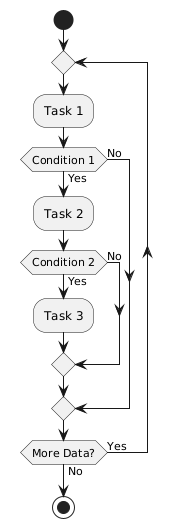 @startuml start repeat :Task 1; if (Condition 1) then (Yes) :Task 2; if (Condition 2) then (Yes) :Task 3; else (No) ' :Continue Loop; endif else (No) ' :Continue Loop; endif repeat while (More Data?) is (Yes) not (No) stop @enduml