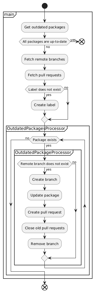 @startuml start group main :Get outdated packages; if (All packages are up-to-date) then (yes) end else (no) endif :Fetch remote branches; :Fetch pull requests; if (Label does not exist) then (yes) :Create label; else (no) endif group OutdatedPackagesProcessor while (Package exists) is (yes) group OutdatedPackageProcessor if (Remote branch does not exist) then (yes) :Create branch; :Update package; :Create pull request; :Close old pull requests; :Remove branch; else (no) endif end group endwhile (no) end group end group end @enduml
