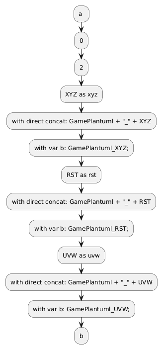 @startuml !$partlen=2 !$data={"partlen": "2", "game": "GamePlantuml", "participants" :[ {"name": "XYZ" ,"as": "xyz"}, {"name": "RST" ,"as": "rst"}, {"name": "UVW" ,"as": "uvw"} ] } !$partlen=$data.partlen !$i=0 :a ; :$i; :$partlen; !foreach $part in $data.participants :$part.name as $part.as; :with direct concat: $data.game + "_" + $part.name; !$b=$data.game + "_" + $part.name; :with var b: $b; !endfor :b; @enduml