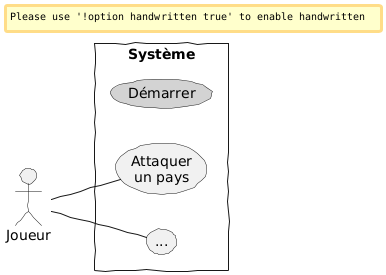 @startuml skinparam style strictuml skinparam backgroundcolor transparent ' this is a handwritten font in Windows 'skinparam defaultfontname Kristen ITC 'These others look great in SVG (make sure they're installed for ALL USERS in Windows 10) skinparam defaultfontname sage sans 'skinparam defaultfontname Ink Journal 'skinparam defaultfontname xkcd Script 'skinparam defaultfontname Petters skinparam handwritten true scale 1 left to right direction skinparam packageStyle rect actor Joueur as J rectangle "Système" { (...) as other (Attaquer\nun pays) as JP (Démarrer) #lightgray J -- JP J -- other } @enduml