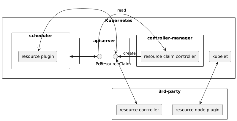 @startuml skinparam componentStyle rectangle component Kubernetes { component scheduler { component "resource plugin" as k8sresourceplugin } component " apiserver " as apiserver { interface Pod interface ResourceClaim } component "controller-manager" as controllermanager { component "resource claim controller" as k8sresourceclaimcontroller } component kubelet } component 3rd-party as 3rdparty { component "resource controller" as vendorcontroller component "resource node plugin" as vendornodeplugin } 'scheduler -[hidden]r-> apiserver 'apiserver -[hidden]r-> controllermanager 'Pod -[hidden]u-> ResourceClaim 'Kubernetes -[hidden]d-> 3rdparty Pod -> k8sresourceclaimcontroller: read ResourceClaim <- k8sresourceclaimcontroller: create Pod <-> scheduler ResourceClaim <-> k8sresourceplugin ResourceClaim <--> vendorcontroller kubelet <--> vendornodeplugin @enduml
