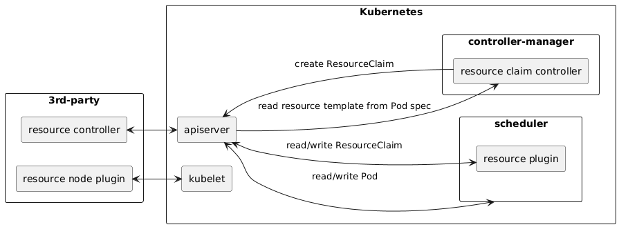 @startuml left to right direction skinparam componentStyle rectangle component Kubernetes { component apiserver component scheduler { component "resource plugin" as k8sresourceplugin } component "controller-manager" as controllermanager { component "resource claim controller" as k8sresourceclaimcontroller } component kubelet } component 3rd-party as 3rdparty { component "resource controller" as vendorcontroller component "resource node plugin" as vendornodeplugin } apiserver --> k8sresourceclaimcontroller: read resource template from Pod spec apiserver <-- k8sresourceclaimcontroller: create ResourceClaim apiserver <--> scheduler: read/write Pod apiserver <--> k8sresourceplugin: read/write ResourceClaim vendorcontroller <--> apiserver vendornodeplugin <--> kubelet @enduml