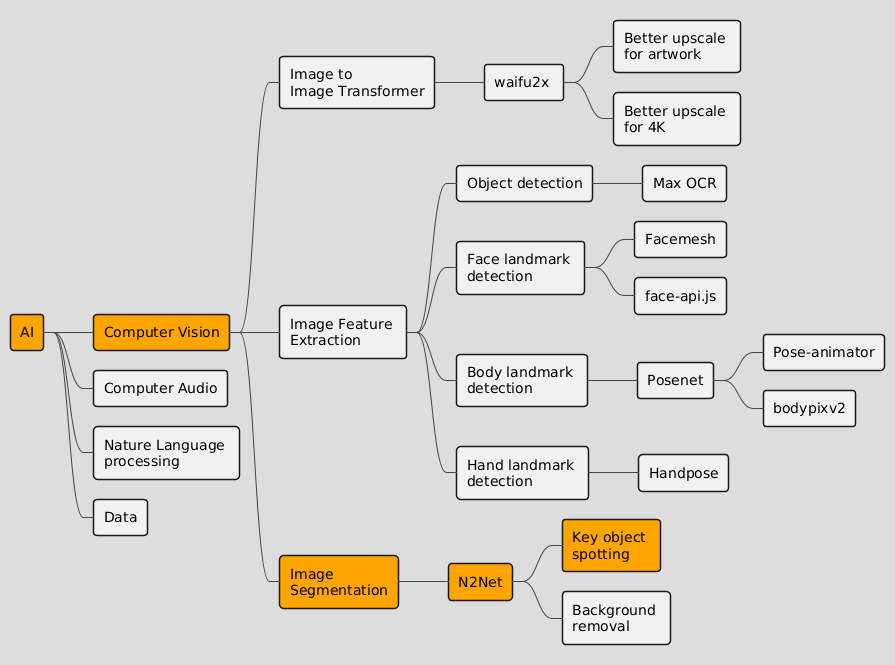 @startmindmap !theme toy Skinparam sequenceArrowThickness 1 skinparam ParticipantPadding 5 skinparam BoxPadding 10 skinparam actorStyle awesome skinparam LegendBorderThickness 0 *[#orange] AI **[#orange] Computer Vision *** Image to \nImage Transformer **** waifu2x ***** Better upscale \nfor artwork ***** Better upscale \nfor 4K *** Image Feature \nExtraction **** Object detection ***** Max OCR **** Face landmark \ndetection ***** Facemesh ***** face-api.js **** Body landmark \ndetection ***** Posenet ****** Pose-animator ****** bodypixv2 **** Hand landmark \ndetection ***** Handpose ***[#orange] Image \nSegmentation ****[#orange] N2Net *****[#orange] Key object \nspotting ***** Background \nremoval ** Computer Audio ** Nature Language \nprocessing ** Data @endmindmap