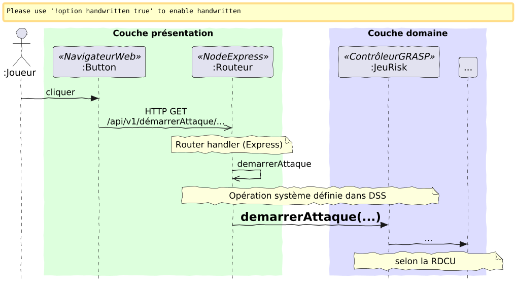 @startuml skinparam style strictuml skinparam backgroundcolor transparent ' this is a handwritten font in Windows 'skinparam defaultfontname Kristen ITC 'These others look great in SVG (make sure they're installed for ALL USERS in Windows 10) skinparam defaultfontname sage sans 'skinparam defaultfontname Ink Journal 'skinparam defaultfontname xkcd Script 'skinparam defaultfontname Petters skinparam handwritten true scale 1.3 skinparam sequenceMessageAlign center skinparam participantPadding 10 skinparam sequenceBoxBorderColor transparent actor ":Joueur" as j box "Couche présentation" #ddffdd participant ":Button" as b <<NavigateurWeb>> participant ":Routeur" as r <<NodeExpress>> end box box "Couche domaine" #ddddff participant ":JeuRisk" as c <<ContrôleurGRASP>> participant "..." as s end box j -> b : cliquer b ->> r : HTTP GET\n/api/v1/démarrerAttaque/... note over r : Router handler (Express) r ->> r : demarrerAttaque note over r, c: Opération système définie dans DSS r -> c : **<size:18>demarrerAttaque(...)** c -> s : ... note over c, s : selon la RDCU @enduml