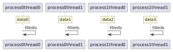 @startuml !pragma teoz true participant process0thread0 as t0 participant process0thread1 as t1 participant process1thread0 as t2 participant process1thread1 as t3 !function $concat($a, $b) return $a + $b !procedure $repeat4($func) %invoke_procedure($func, 0) & %invoke_procedure($func, 1) & %invoke_procedure($func, 2) & %invoke_procedure($func, 3) !endprocedure !procedure $data($i) rnote over $concat(t, $i): $concat(data, $i) !endprocedure $repeat4($data) !procedure $fillinfo($i) $concat(t, $i)->$concat(t, $i): fillinfo !endprocedure $repeat4($fillinfo) @enduml