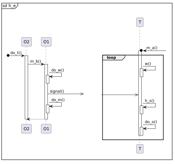 @startuml mainframe sd h_e label l1 [ {{ [o-> O2 : do_t() activate O2 O2 -> O1 : m_b() activate O1 O1 -> O1 : do_w() activate O1 deactivate O1 O1 ->>] : signal() \t\t O1 -> O1 : do_m() activate O1 deactivate O1 O2 <-- O1 deactivate O1 deactivate O2 }} ] label l2 [ {{ ||| ||| T o<-] : m_a() activate T loop T -> T : w() activate T deactivate T ||| [->> T : \t\t\t T -> T : h_s() activate T deactivate T T -> T : do_o() activate T deactivate T deactivate T end }} ] @enduml