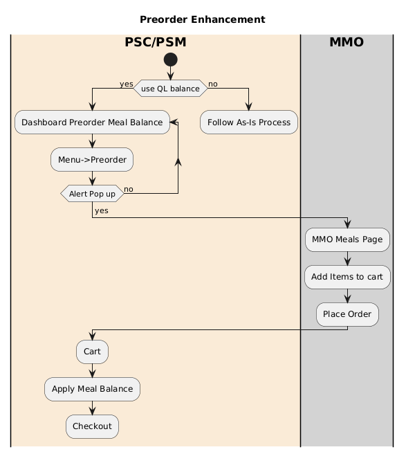 @startuml title Preorder Enhancement |#Antiquewhite|**PSC/PSM**| start if (use QL balance) then (yes) repeat :Dashboard Preorder Meal Balance; :Menu->Preorder; repeat while (Alert Pop up) is (no) ->yes; |#lightgrey|**MMO**| :MMO Meals Page; :Add Items to cart; :Place Order; |#Antiquewhite|**PSC/PSM**| :Cart; :Apply Meal Balance; :Checkout; kill else (no) :Follow As-Is Process; kill endif @enduml