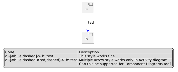 @startuml component "a" as a { } component "b" as b { } ' this does not work: ' a -[#blue,dashed;#red]-> b: test a -[#blue,dashed]-> b: test legend | Code | Description | | a -[#blue,dashed]-> b: test | This style works fine | | a -[#blue,dashed;#red,dashed]-> b: test | Multiple arrow style works only in Activity diagram\n Can this be supported for Component Diagrams too? | end legend @enduml