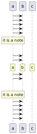 @startuml participant a participant b participant c !procedure $insert_participants() rnote over a #FEFECE: a /rnote over b #FEFECE: b /rnote over c #FEFECE: c !endprocedure a->b a->b a->b a->b a->b rnote over a : it is a note ... a->b a->b $insert_participants() a->b a->b ... rnote over a : it is a note a->b a->b a->b a->b a->b @enduml
