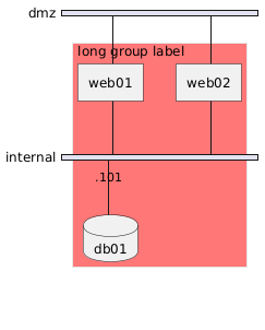 @startuml nwdiag { group { color = "#FF7777"; description = "long group label"; web01; web02; db01; } network dmz { web01; web02; } network internal { web01; web02; db01 [address = ".101", shape = database]; } } @enduml