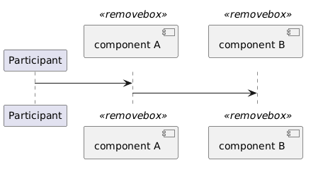 @startuml <STYLE> .removebox { sequenceDiagram { participant { Shadowing 0 BackGroundColor #00000000 LineColor #00000000 } } } </STYLE> participant "Participant" as P participant "{{\n[component A]\n}}" as A <<removebox>> participant "{{\n[component B]\n}}" as B <<removebox>> P -> A A -> B @enduml