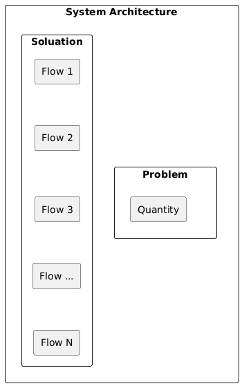 @startuml rectangle "System Architecture" as map { rectangle "Soluation" as solution { rectangle "Flow 1" as flow_1 { } rectangle "Flow 2" as flow_2 { } flow_1 -down[hidden]-> flow_2 rectangle "Flow 3" as flow_3 { } flow_2 -down[hidden]-> flow_3 rectangle "Flow ..." as flow_ { } flow_3 -down[hidden]-> flow_ rectangle "Flow N" as flow_n { } flow_ -down[hidden]-> flow_n } rectangle "Problem" as problem { rectangle "Quantity" as quantity { } } problem -[hidden]> flow_3 } @enduml