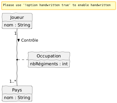 @startuml skinparam style strictuml skinparam backgroundcolor transparent ' this is a handwritten font in Windows 'skinparam defaultfontname Kristen ITC 'These others look great in SVG (make sure they're installed for ALL USERS in Windows 10) skinparam defaultfontname sage sans 'skinparam defaultfontname Ink Journal 'skinparam defaultfontname xkcd Script 'skinparam defaultfontname Petters skinparam handwritten true scale 1 hide empty members class Joueur { nom : String } class Pays { nom : String } class Occupation { nbRégiments : int } Joueur "1" -- "1..*" Pays : Contrôle > (Joueur, Pays) .. Occupation @enduml