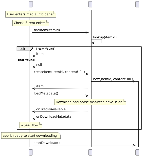@startuml <style> group { LineThickness 1 } </style> participant "app: Application" as app participant "cm: ContentManager" as cm participant "item: DownloadItem" as item activate app activate cm note over app: User enters media info page note over app: Check if item exists app->cm: findItem(itemId) cm->cm: lookup(itemId) alt item found cm-->app: item else not found cm-->app: null app->cm: createItem(itemId, contentURL) cm->item: new(itemId, contentURL) activate item cm-->app: item app->cm: loadMetadata() note over cm Download and parse manifest, save in db end note cm-->app: onTracksAvailable cm-->app: onDownloadMetadata note over app: * See //track-selection// flow end group note over app: app is ready to start downloading app->item: startDownload() @enduml