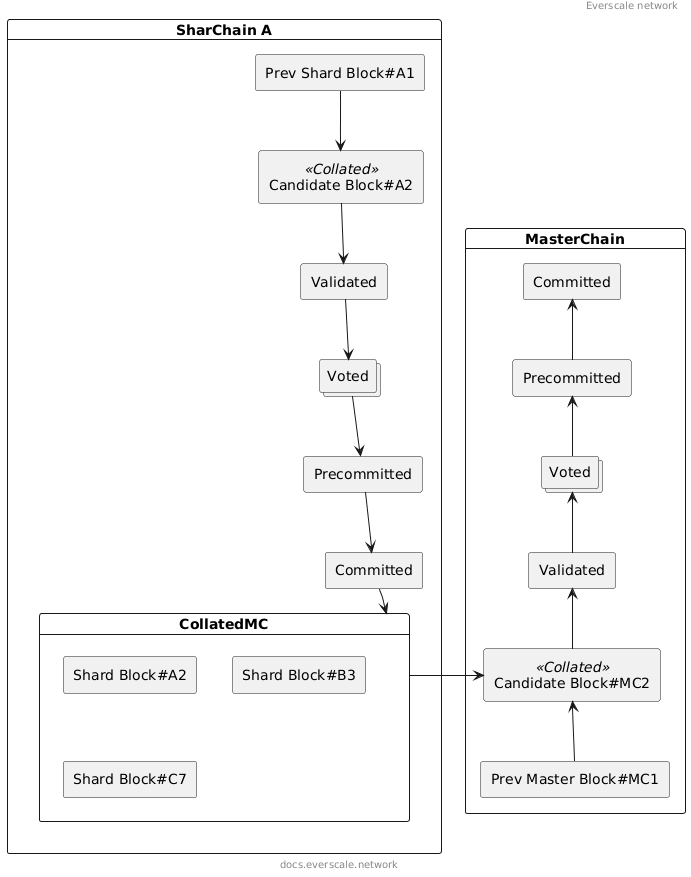 @startuml skinparam componentStyle rectangle header Everscale network footer docs.everscale.network card "SharChain A" { component "Prev Shard Block#A1" as Prev component "Candidate Block#A2" <<Collated>> as Candidate component Validated collections Voted component Precommitted component Committed Prev --> Candidate Candidate --> Validated Validated --> Voted Voted --> Precommitted Precommitted --> Committed Committed --> CollatedMC } card "Collated MC" as CollatedMC { component "Shard Block#A2" as A2 component "Shard Block#B3" as B3 component "Shard Block#C7" as C7 } card "MasterChain" { component "Prev Master Block#MC1" as PrevMC component "Candidate Block#MC2" <<Collated>> as CandidateMC CollatedMC -r-> CandidateMC component Validated as ValidatedMC collections Voted as VotedMC component Precommitted as PrecommittedMC component Committed as CommittedMC PrevMC -u-> CandidateMC CandidateMC -u-> ValidatedMC ValidatedMC -u-> VotedMC VotedMC -u-> PrecommittedMC PrecommittedMC -u-> CommittedMC } @enduml