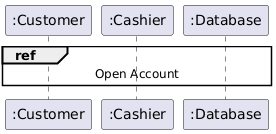 @startuml skinparam SequenceReferenceBackgroundColor transparent <style> Reference { BackgroundColor transparent } </style> participant ":Customer" as customer participant ":Cashier" as cashier participant ":Database" as database ref over customer, database : Open Account @enduml