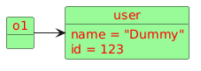 @startuml skinparam ObjectFontColor red skinparam ObjectAttributeFontColor red skinparam ObjectBackgroundColor palegreen object o1 object user { name = "Dummy" id = 123 } o1 -> user @enduml