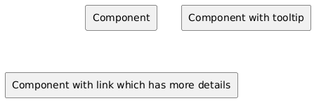 @startuml rectangle "Component" rectangle "Component with tooltip" [[{more details see\nhttps://plantuml.com/link}]] rectangle "Component with link which has more details" [[https://plantuml.com/link{please follow the link\n that you get more details} More details....]] @enduml