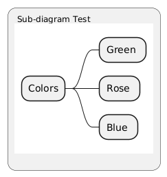 @startuml <style> mindmapDiagram { .green { BackgroundColor lightgreen } .rose { BackgroundColor #FFBBCC } .your_style_name { BackgroundColor lightblue } } </style> : Sub-diagram Test {{mindmap * Colors ** Green <<green>> ** Rose <<rose>> ** Blue <<your_style_name>> }} ; @enduml