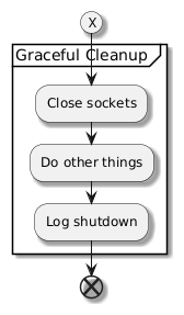 @startuml <style> partition { BackgroundColor white } end { BackgroundColor white } </style> skinparam shadowing true (X) partition "Graceful Cleanup " { :Close sockets; :Do other things; :Log shutdown; } end @enduml