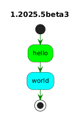 @startuml title %version() <style> activityDiagram { arrow { LineColor green } .x { BackgroundColor #00ff00 } .y { BackgroundColor #00ffff } } </style> start << x >>:hello; << y >>:world; stop @enduml