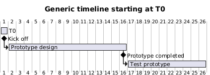 @startgantt title Generic timeline starting at T0 [T0] lasts 1 days [Kick off] happens at [T0]'s end then [Prototype design] lasts 15 days [Prototype completed] happens at [Prototype design]'s end [Test prototype] lasts 10 days [Test prototype] starts at [Prototype design]'s end @endgantt