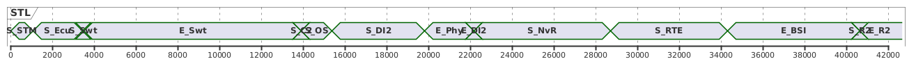 @startuml !$STL = { "log2" : [ {"Dvalue" : 83889, "value" : 0, "str" : "S_STM"}, {"Dvalue" : 1079, "value" : 1079, "str" : "S_Ecu"}, {"Dvalue" : 2355, "value" : 3434, "str" : "S_Swt"}, {"Dvalue" : 81, "value" : 3515, "str" : "E_Swt"}, {"Dvalue" : 10406, "value" : 13921, "str" : "S_C2"}, {"Dvalue" : 2, "value" : 13923, "str" : "S_OS"}, {"Dvalue" : 1455, "value" : 15383, "str" : "S_DI2"}, {"Dvalue" : 4450, "value" : 19833, "str" : "E_Phy"}, {"Dvalue" : 2337, "value" : 22170, "str" : "E_DI2"}, {"Dvalue" : 1, "value" : 22171, "str" : "S_NvR"}, {"Dvalue" : 5600, "value" : 28710, "str" : "S_RTE"}, {"Dvalue" : 73, "value" : 34310, "str" : "E_BSI"}, {"Dvalue" : 6254, "value" : 40638, "str" : "S_R2"}, {"Dvalue" : 25, "value" : 40664, "str" : "E_R2"} ] } scale 2000 as 60 pixels concise STL !foreach $el in $STL.log2 $el.value is $el.str !endfor @enduml