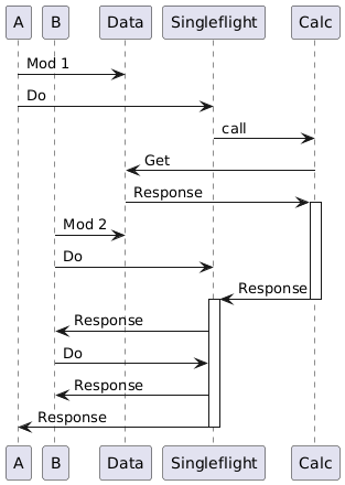 @startuml participant A participant B participant Data participant Singleflight A->Data: Mod 1 A->Singleflight: Do Singleflight->Calc: call Calc->Data: Get Data->Calc: Response activate Calc B->Data: Mod 2 B->Singleflight: Do Calc->Singleflight: Response deactivate Calc activate Singleflight Singleflight->B: Response B->Singleflight: Do Singleflight->B: Response Singleflight->A: Response deactivate Singleflight @enduml