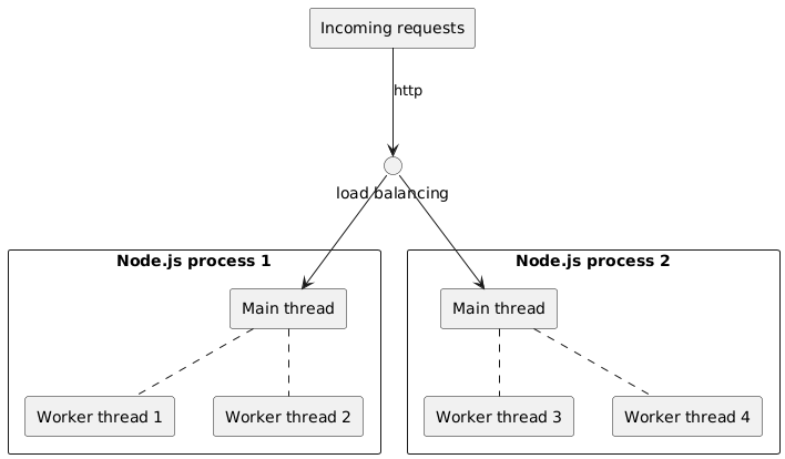 @startuml agent "Incoming requests" as http interface "load balancing" as lb rectangle "Node.js process 1" { agent "Main thread" as main1 agent "Worker thread 1" as w1 agent "Worker thread 2" as w2 } rectangle "Node.js process 2" { agent "Main thread" as main2 agent "Worker thread 3" as w3 agent "Worker thread 4" as w4 } http --> lb : http lb --> main1 lb --> main2 main1 .. w1 main1 .. w2 main2 .. w3 main2 .. w4 @enduml