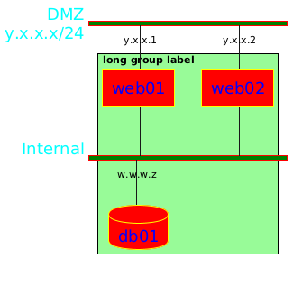 @startuml <style> nwdiagDiagram { network { BackGroundColor green LineColor red LineThickness 1.0 FontSize 18 FontColor cyan } server { BackGroundColor red LineColor yellow LineThickness 1.0 ' FontXXX for both description or address FontSize 18 FontColor #blue } group { BackGroundColor palegreen LineColor black LineThickness 2.0 FontSize 11 FontStyle bold Margin 5 Padding 5 } } </style> nwdiag { network DMZ { address = "y.x.x.x/24" web01 [address = "y.x.x.1"]; web02 [address = "y.x.x.2"]; } network Internal { web01; web02; db01 [address = "w.w.w.z", shape = database]; } group { 'color = "#77FF77"; description = "long group label"; web01; web02; db01; } } @enduml