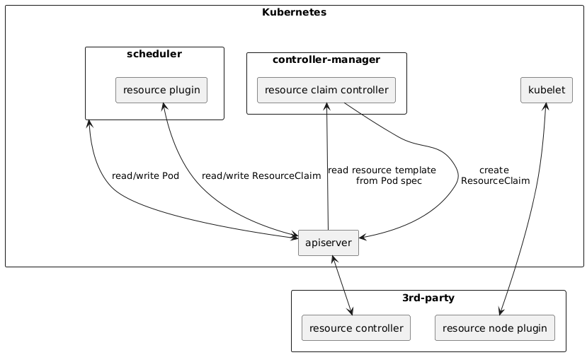 @startuml skinparam componentStyle rectangle together { component Kubernetes { component apiserver together { component scheduler { component "resource plugin" as k8sresourceplugin } component "controller-manager" as controllermanager { component "resource claim controller" as k8sresourceclaimcontroller } } component kubelet } component 3rd-party as 3rdparty { component "resource controller" as vendorcontroller component "resource node plugin" as vendornodeplugin } } apiserver --u-> k8sresourceclaimcontroller: read resource template \n from Pod spec apiserver <-u-- k8sresourceclaimcontroller: create\n ResourceClaim apiserver <--> scheduler: read/write Pod apiserver <--> k8sresourceplugin: read/write ResourceClaim apiserver <--> vendorcontroller kubelet <--> vendornodeplugin @enduml