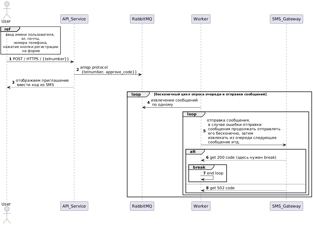 @startuml 'https://plantuml.com/sequence-diagram actor User participant API_Service as Api participant RabbitMQ as RMQ participant Worker as Worker participant SMS_Gateway as SMS autonumber ref over User: ввод имени пользователя, \n эл. почты, \n номера телефона, \n нажатие кнопки регистрации \n на форме User -> Api: POST / HTTPS / {telnumber}} Api -> RMQ: amqp protocol \n {telnumber, approve_code}} User <-- Api: отображаем приглашение \n ввести код из SMS loop бесконечный цикл опроса очереди и отправки сообщений Worker -> RMQ: извлечение сообщений \n по одному loop Worker -> SMS: отправка сообщения, \n в случае ошибки отправки \n сообщения продолжать отправлять \n его бесконечно, затем \n извлекать из очереди следующее \n сообщение итд. alt SMS --> Worker: get 200 code (здесь нужен break) break Worker -> Worker : end loop end else SMS --> Worker: get 502 code end end end @enduml